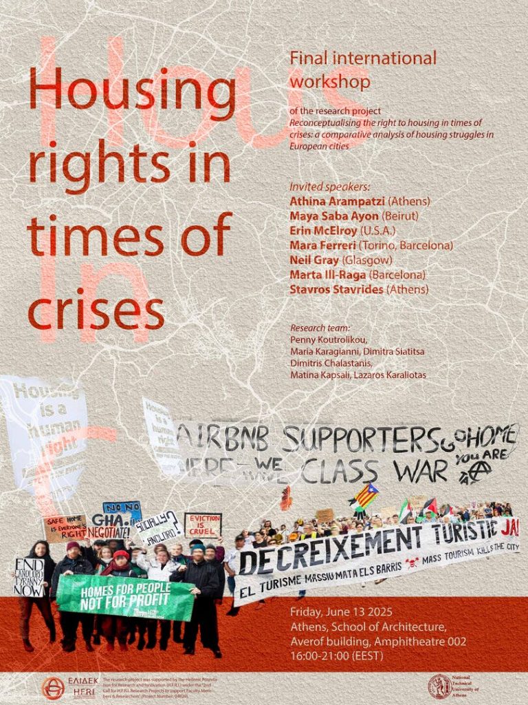 This project aims to reconceptualise the right to housing by examining the ways in which the continuum of crises since 2008 has impacted and transformed the fields of housing provision and housing struggles in European cities. To serve this aim, the project has two objectives: (a) to develop novel conceptual tools towards the re-theorisation of the housing question in the context of the multiple, intersecting recent crises; and (b) to perform an innovative comparative analysis of contemporary housing struggles in three European cities: Athens, Glasgow and Barcelona. Conceptually, the project builds upon two key concepts, the continuum of crises and their intersection, and housing struggles as urban political struggles.