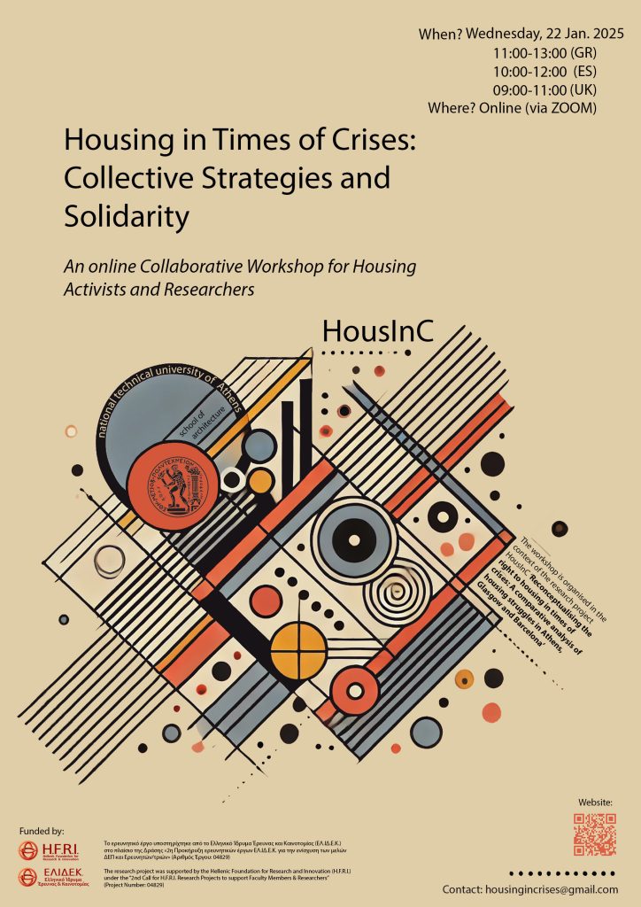 In January 2025, the HousInC research team held a closed, online interim workshop with activists and members of housing movements from Athens, Glasgow, and Barcelona. The aim of this workshop was to share our initial findings, gather valuable feedback, and foster connections among housing struggles across these diverse urban contexts.